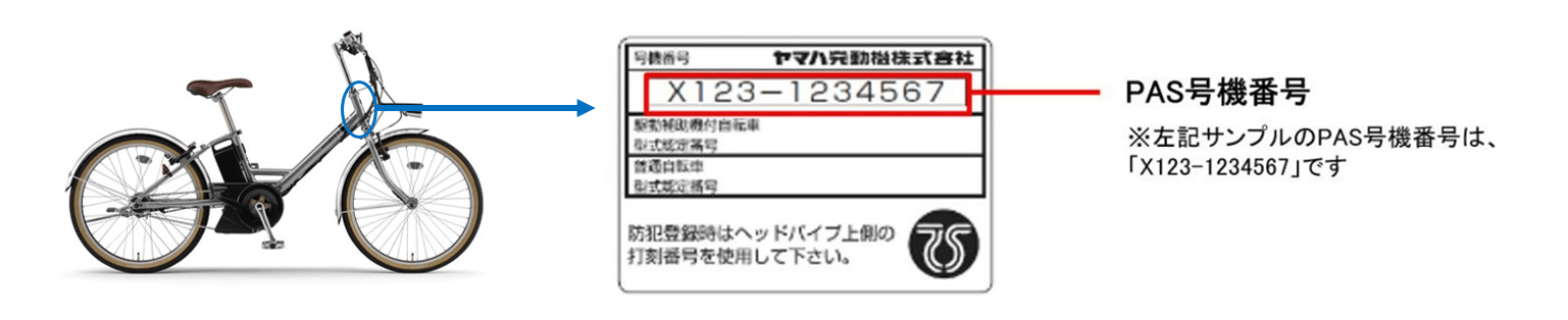 ※PAS号機番号は、フレームのヘッドパイプ部に貼付されている銀色の製品ラベルに印字されています。