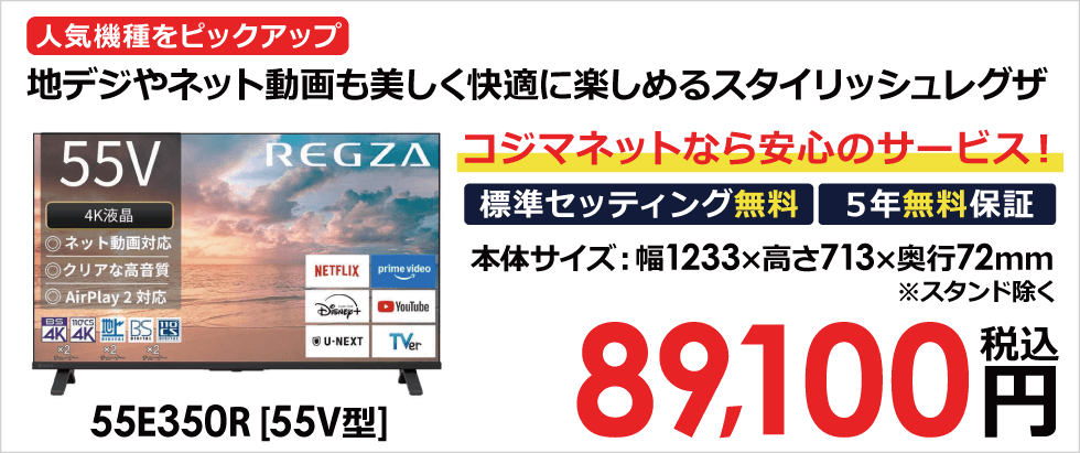 TVS REGZA 液晶テレビ REGZA(レグザ) [55V型 / Bluetooth対応 / BS・CS 4Kチューナー内蔵 / YouTube対応] 55E350R