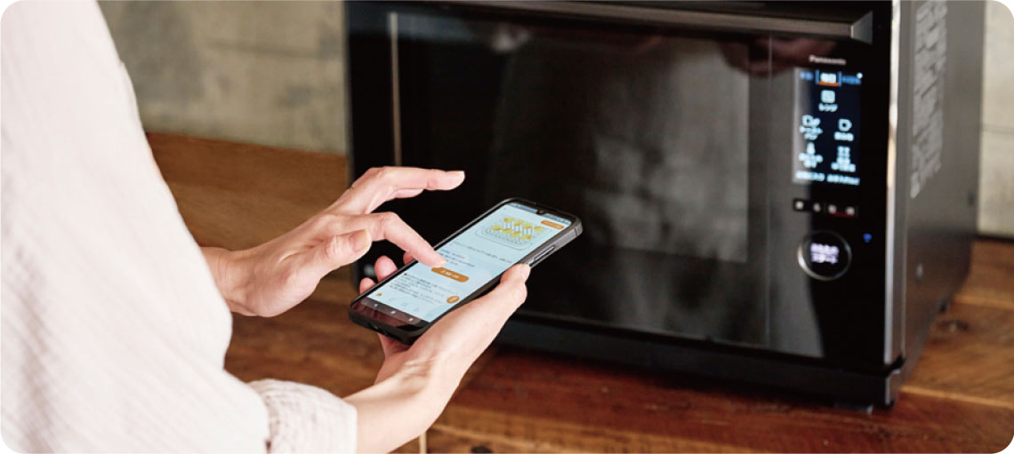 通勤時間などにスマホでレシピ検索。それをレンジに送って時短調理。買った後もスマホでメニューを増やせるレンジです。