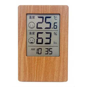 お部屋のインテリアにもマッチする木目調の時計付きデジタル温湿度計